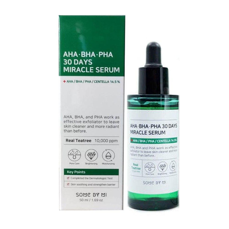 SOME BY MI - AHA, BHA, PHA 30 Days Miracle Serum 50ml. Work wonders on your skin in just 30 days with this tea tree serum! Infused with 10,000ppm tea tree leaf water and 14.5% centella extract, this serum soothes and moisturizes while minimizing pores.